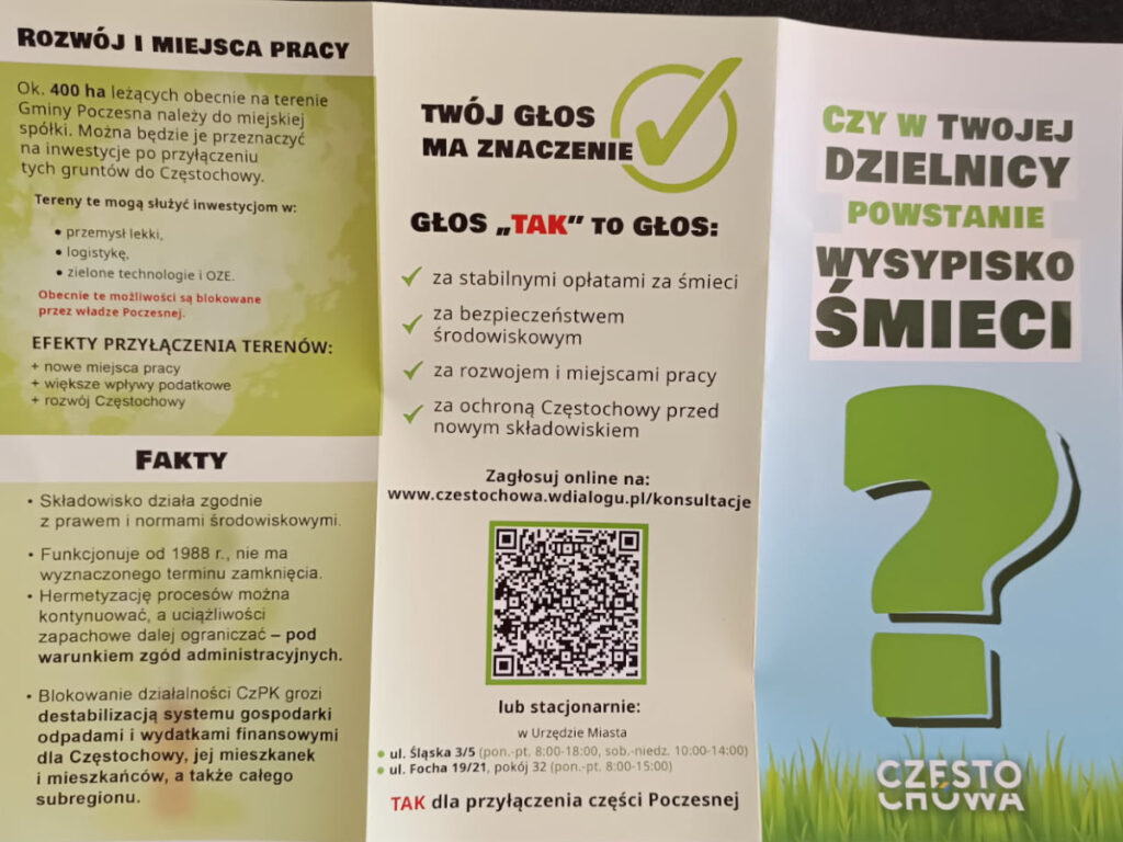 W ostatnich dniach Częstochowianie mogą znaleźć w swoich skrzynkach pocztowych ulotki, których treść ma wywołać panikę, strach i oburzenie. Jak bowiem inaczej skomentować widniejące na ulotce pytanie: „Czy w twojej dzielnicy powstanie wysypisko śmieci?”